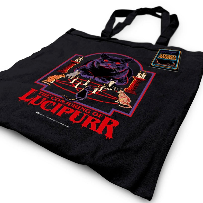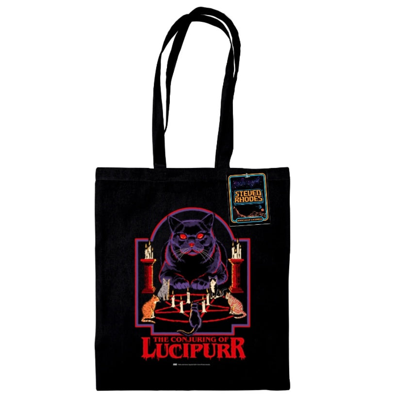 Steven Rhodes official Lucipurr cotton tote bag - a must-have for those who embrace their quirky and dark sense of style. Crafted from high-quality black cotton, this tote bag features the iconic Lucipurr design, combining vintage charm with a devilishly fun twist. Whether you're heading to the grocery store, the beach, or a casual outing, let your personality shine through with this unique and eye-catching accessory.