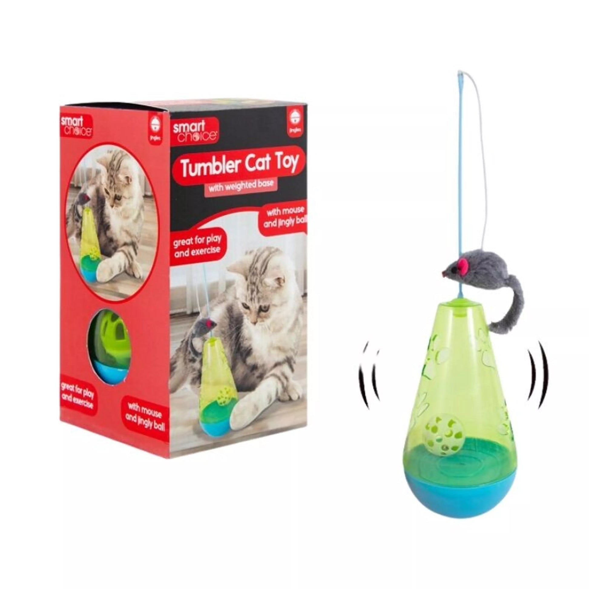 A fun, interactive tumbler cat toy with a furry little mouse.